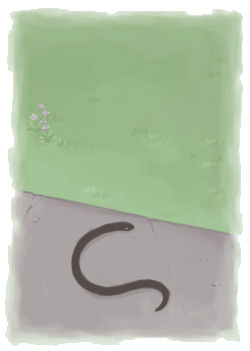 「ああ、おどろいた。えん側のサッシのわくに、ヘビがピッタリはまりこんでいてね。それにペタッとさわっちゃった。でも、ヘビもびっくりしたのね。テラスにボトッと落ちて逃げて行っちゃった。」